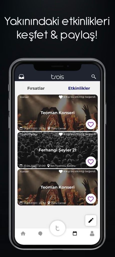 Trois sadece üniversite öğrencilerinin kullanabildiği bir sosyal medya platformudur.Trois’i kullanarak kendi üniversitenden veya şehrindeki diğer okullardan insanlarla arkadaş olabilir,etkinliklerden,konserlerden haberdar olabilirsin.Sadece Trois’e özel kafelerdeki fırsatlardan yararlanabilir,Trois özel partilerine katılabilirsin.Trois sayesinde şehrindeki konser,etkinlik,konferans ve festivaller her zaman elinin altında olacak.Vize ve final haftalarında takıldığın konuları üniversitene özel bölümde arkadaşlarınla tartışabilir veya aynı bölümü okuduğun şehrindeki insanlarla yardımlaşabilirsin.